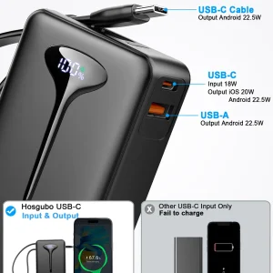 • USB-C In & Out with Built-In Cable – Enjoy true two-way charging convenience while eliminating extra cables. Charge your devices and recharge your power bank with one compact solution.