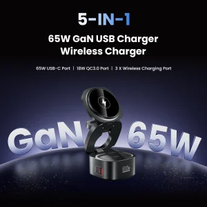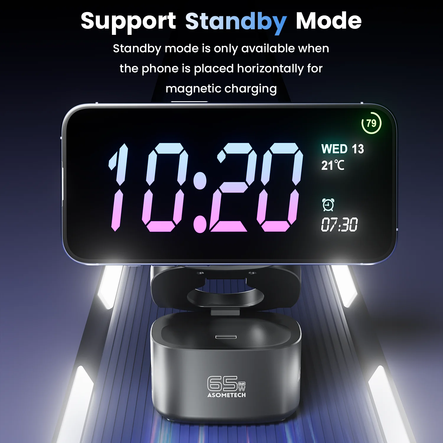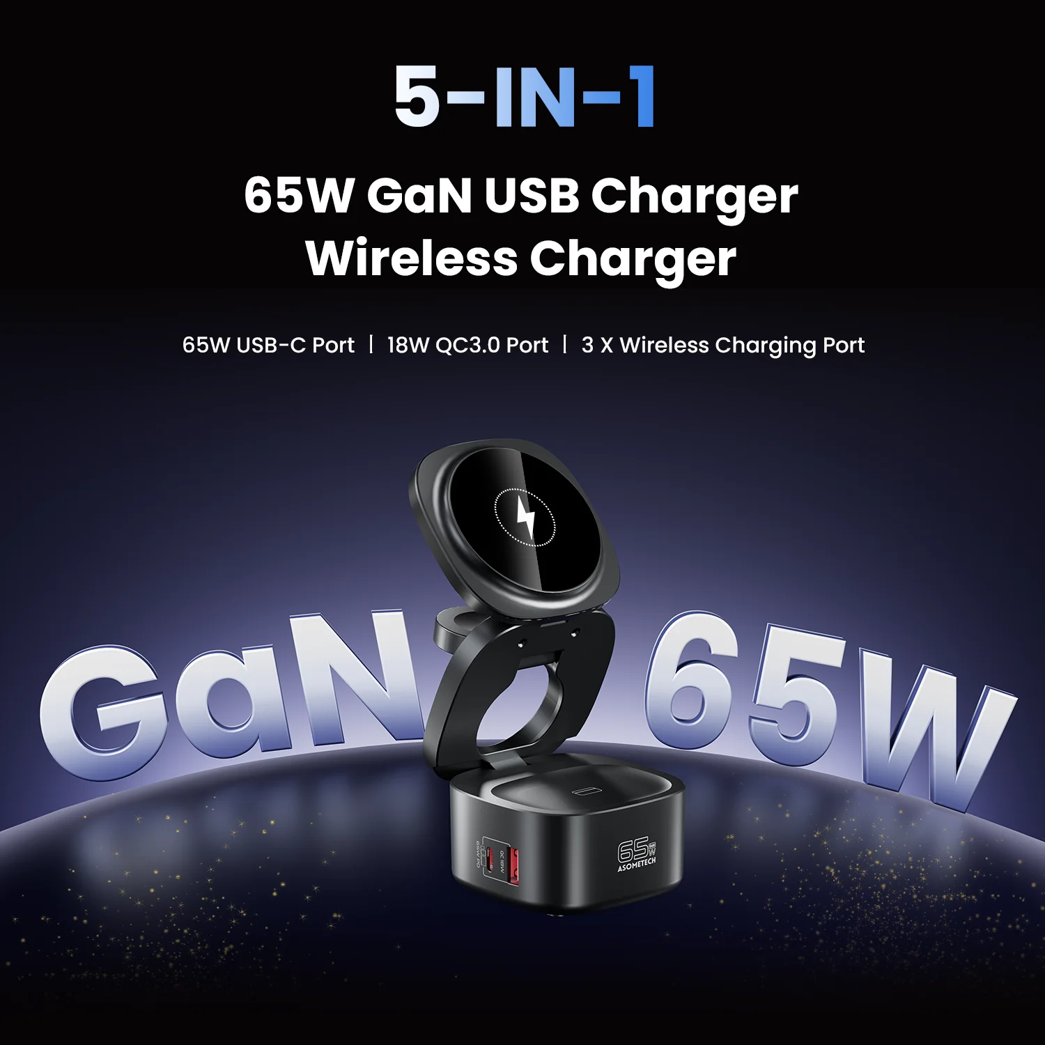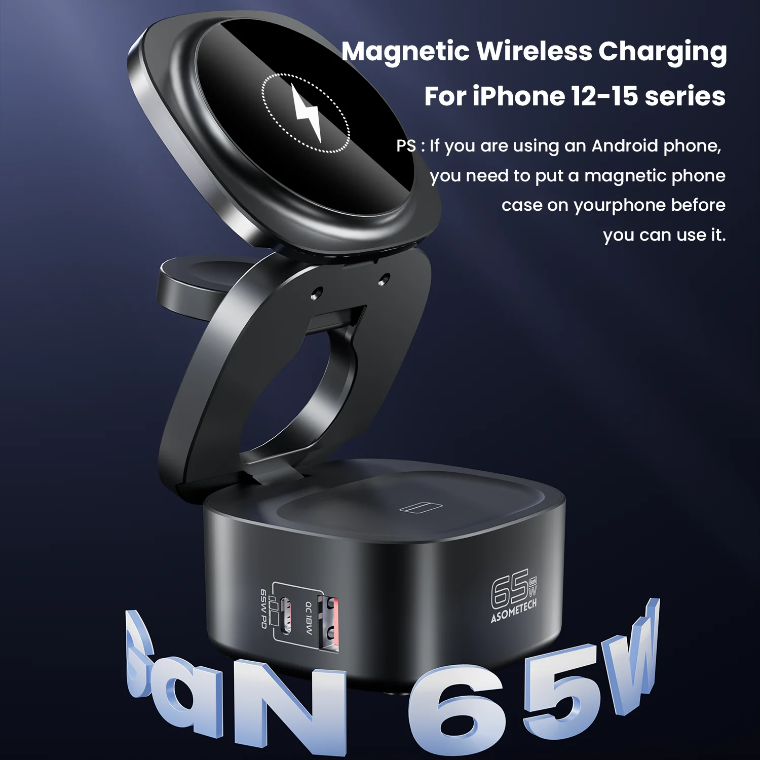 The ASOMETECH 65W GaN 5-in-1 Magnetic Charging Station is designed for users who want fast, organized, and reliable charging in one elegant solution. Its powerful GaN technology delivers high-speed charging while staying compact and cool, making it ideal for home, office, and travel use.